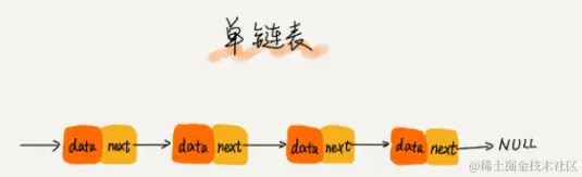 链表通过指针将一组零散的内存块串联在一起。其中,我们把内存块称为链表的“结点”。为了将所有的结点串起来,每个链表的结点除了存储数据之外,还需要记录链上的下一个结点的地址。如图所示,我们把这个记录下个结点地址的指针叫作后继指针 next。