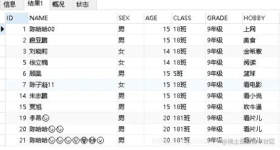 INSERT INTO `student` (`ID`, `NAME`, `SEX`, `AGE`, `CLASS`, `GRADE`, `HOBBY`)VALUES (null, '陈哈哈😓😓', '男', '20', '181班', '9年级', '看片儿');