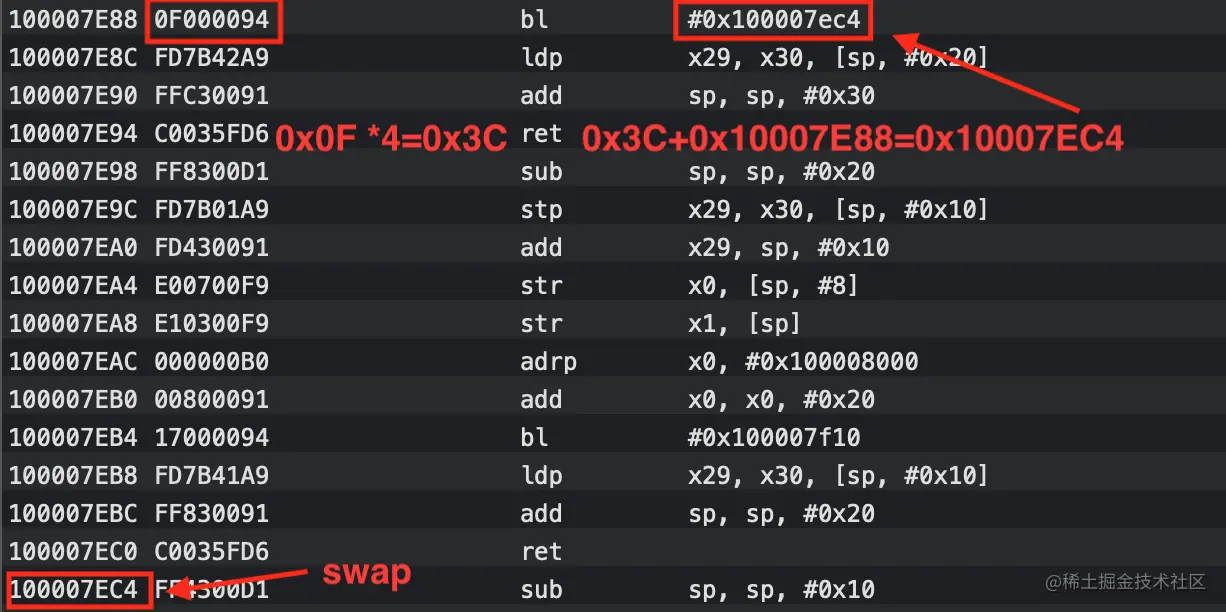 由于同一模块内的相对位置是固定的,所以模块内跳转、函数调用可以是相对地址调用。指令跳转在 x86 使用的是 call 指令,指令码是 E8,在静态链接中提到过这是近址相对位移调用指令,这种指令是不需要重定位的。在 arm64 架构上寻址方式有些区别,arm64 跳转使用的是 bl 指令,指令码是 94 或者 97,97 表示向前跳转 94 表示向后跳转,它的偏移计算公式为:(目标地址 - 指令地址)/ 4。通过 MachOView 探究下 swap 跳转的寻址过程:
