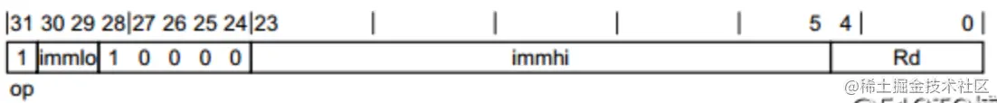 以页为单位的大范围的地址读取指令。符号扩展一个 21 位的 offset(immhi+immlo), 向左移动 12 位,PC 的值的低 12 位清零,然后把这两者相加,结果写入到 x8 寄存器,用来得到一块含有 bString 的 4KB 对齐内存区域的 base 地址(也就是说 bString 所在的地址,一定落在这个 4KB 的内存区域里), 可用来寻址 +/- 4GB 的范围(2^33次幂)。