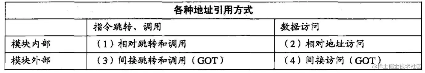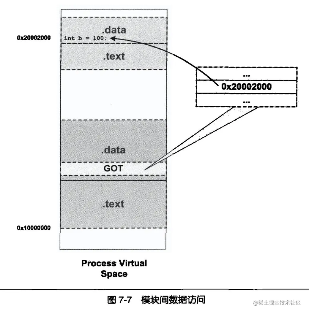 模块间的调用和跳转也是采用通过 GOT 间接跳转的方法解决,基本和模块间数据访问一致,只不过 GOT 中相应的项保存的是目标函数的地址。
