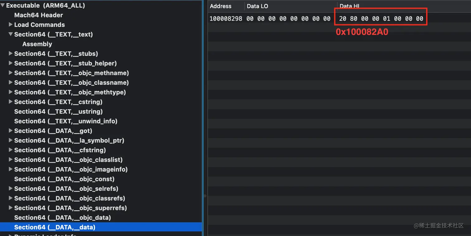 0x100008010 位于 __la_symbol_ptr 段,不止 NSLog,所有引用外部的函数最后都会跳转到 __la_symbol_ptr 段的相应项上,下面再看看 __la_symbol_ptr 里面是什么。