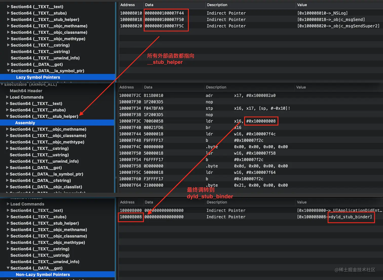 - __stub_helper 里的代码逻辑,通过各种辗转最终调用 dyld_stub_binder 函数。
