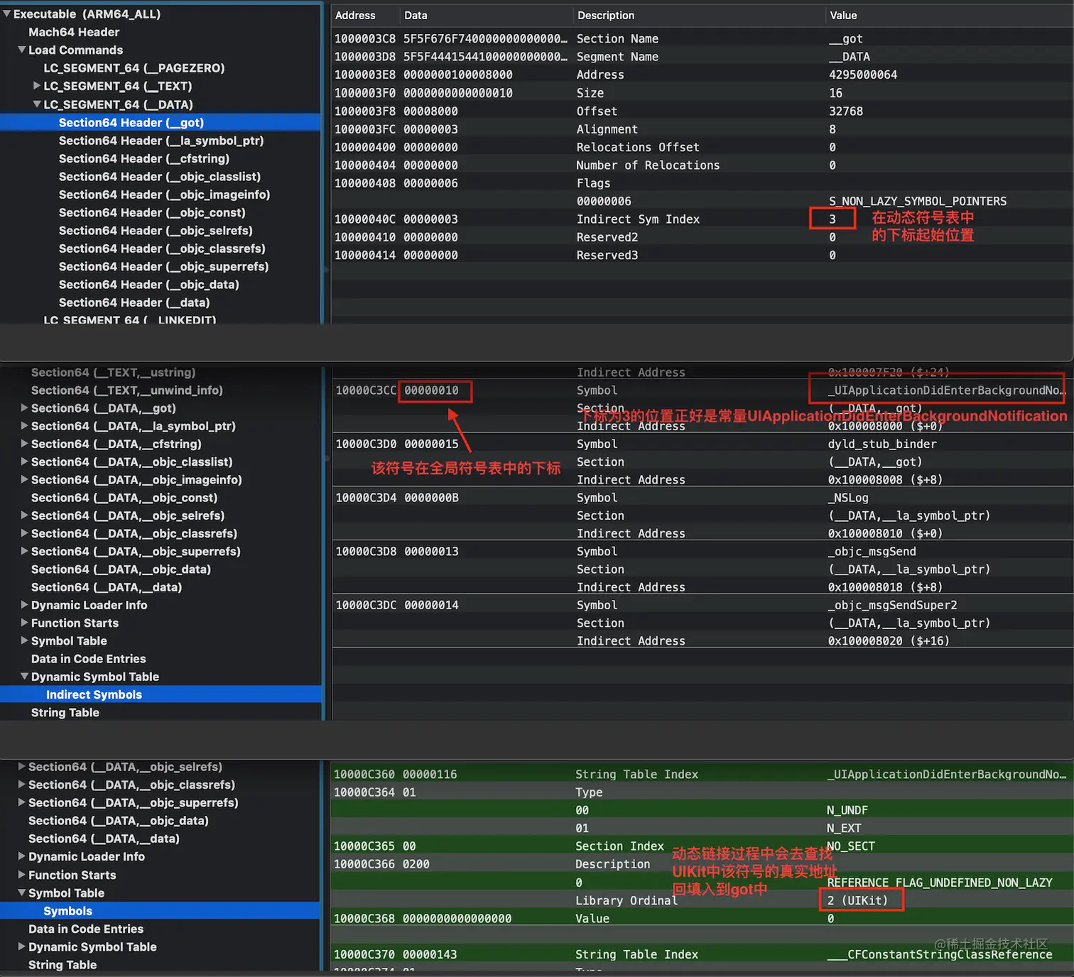 当镜像文件被加载时,dyld 动态链接器会对 got 段中每个条目所对应的符号进行重定位,将其真正的地址填入。那么 dyld 是如何找到 got 中的符号在符号表中的位置的呢?每个 segment 由LC_SEGMENT 命令定义,该命令后的参数描述了 segment 包含的 section 信息,对应结构体是section_64: