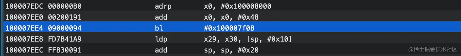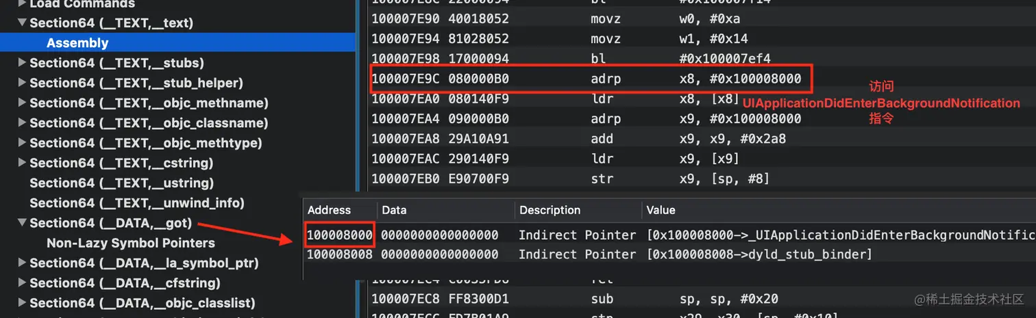 Mach-O 中代码段对函数的引用最终都会指向 stubs 段,如下图是代码段对 NSLog 的调用指令,0x100007f08 正好在 stubs 段: