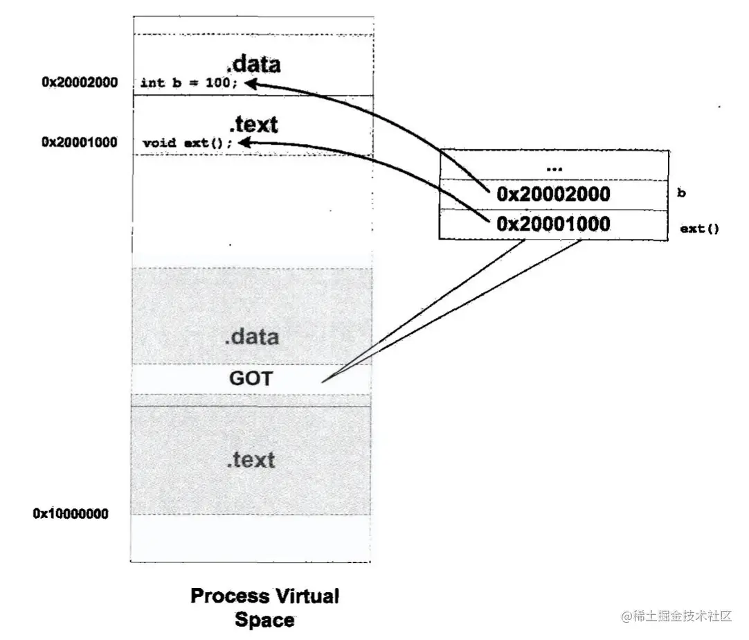 当指令中需要访问变量 b 时,程序会先找到 GOT,然后根据 GOT 中变量所对应的项找到变量的目标地址。如下图所示: