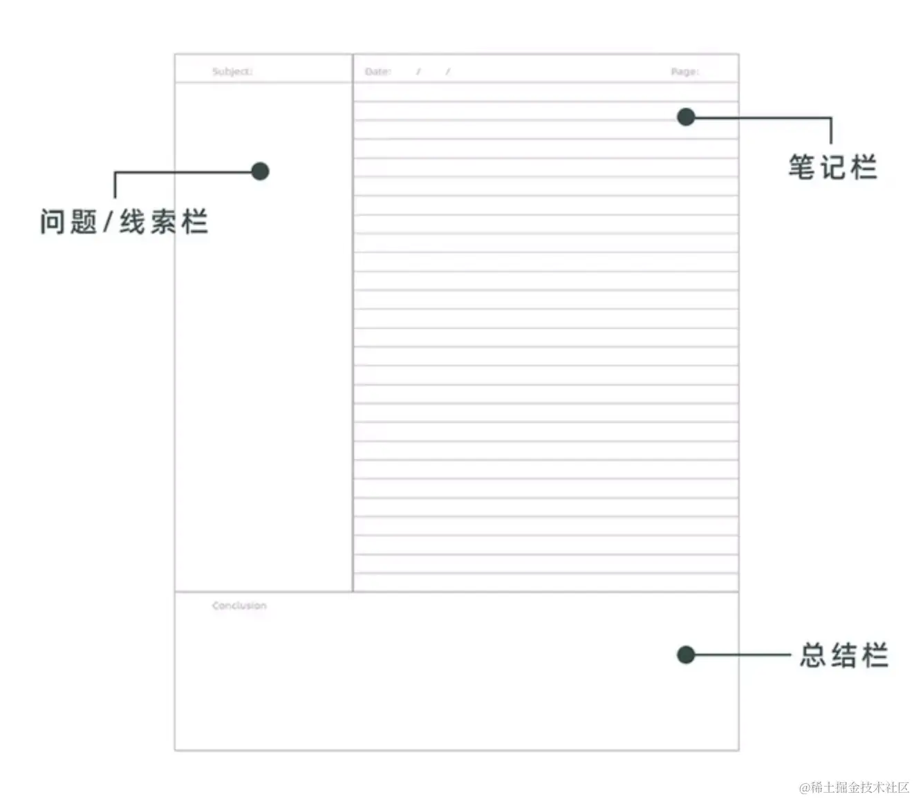 康奈尔笔记法相对系统化,至于如何让笔记主体记录更明确?如何更好地提炼要点?这需要长期坚持记笔记和优化笔记方式(熟练习惯符号、缩写等,形式上的优化如+图、表格等),这通常无捷径,唯手熟尔。