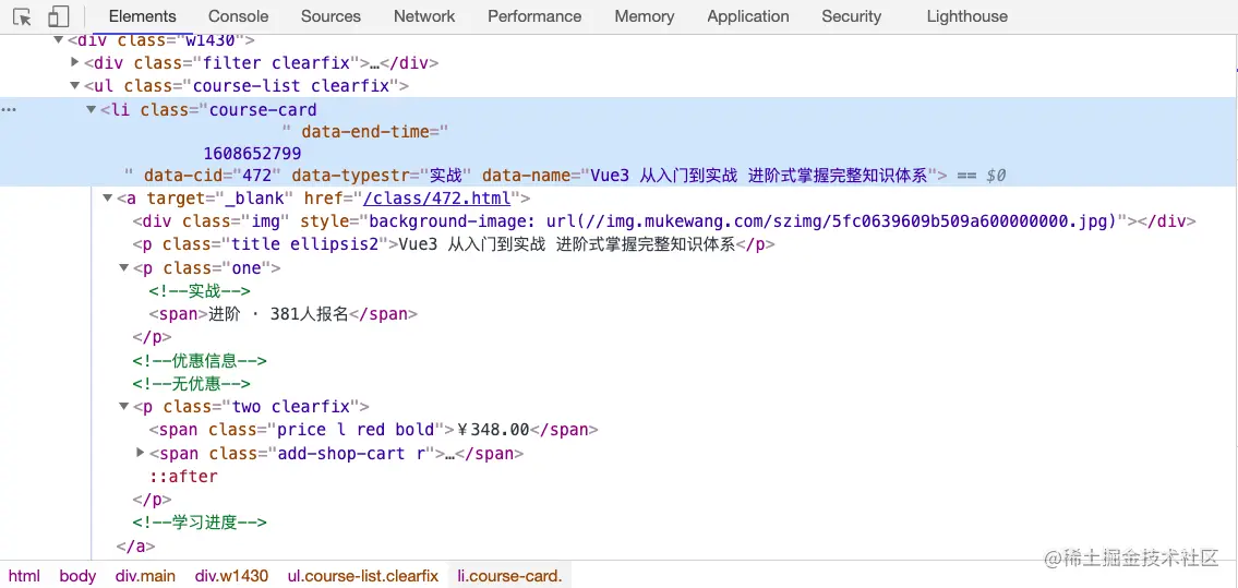 开始写爬虫之前我们需要对我们的目标网页进行结构分析,观察我们所需要的信息存储在那些标签之中,可能让我们更准确的就行爬取;拿我们的这个例子来说,我们随便选择一门课程,右击检查,如下图所示:我们可以看到每一门课程都是放在一个li标签之中