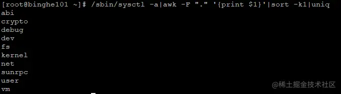 /sbin/sysctl -a|awk -F "." '{print $1}'|sort -k1|uniq