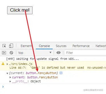 下图可以看到 ref 绑定的确实是 button,而不是 FancyButton。绑定到 FancyButton 的 ref 被转发到了 button 上。