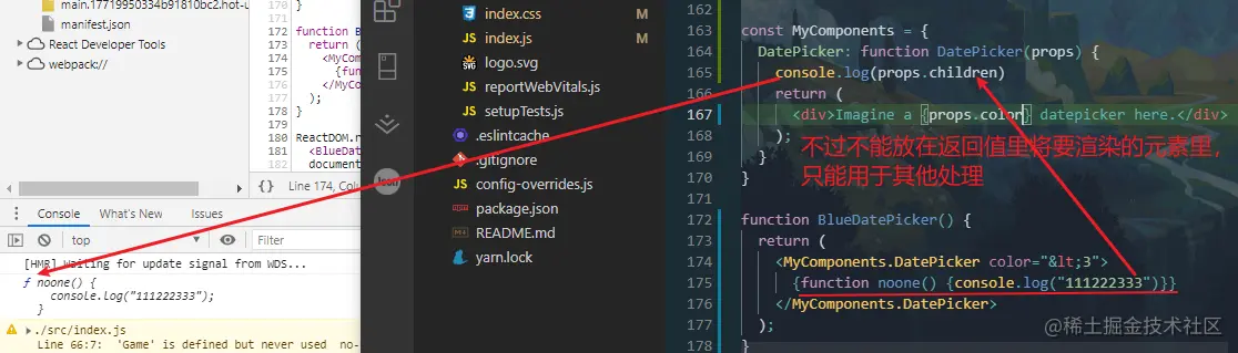 如图所示,函数可以被传入 props.children,不过不能渲染出来,可以传给组件做别的处理。 - null,undefined,false 等值会被无视,如果要传,只能先转为字符串。