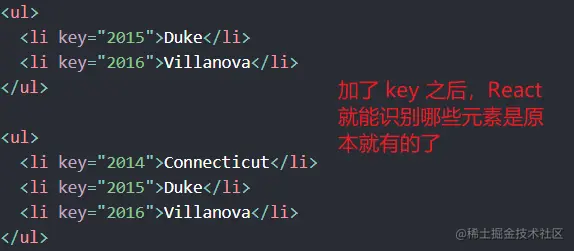 - 当子元素有 key 的时候,React 就知道哪些元素是移动过的了。