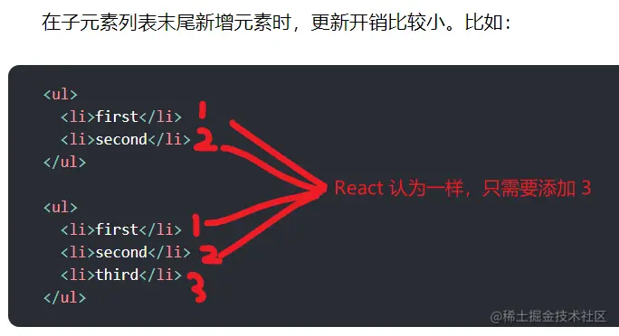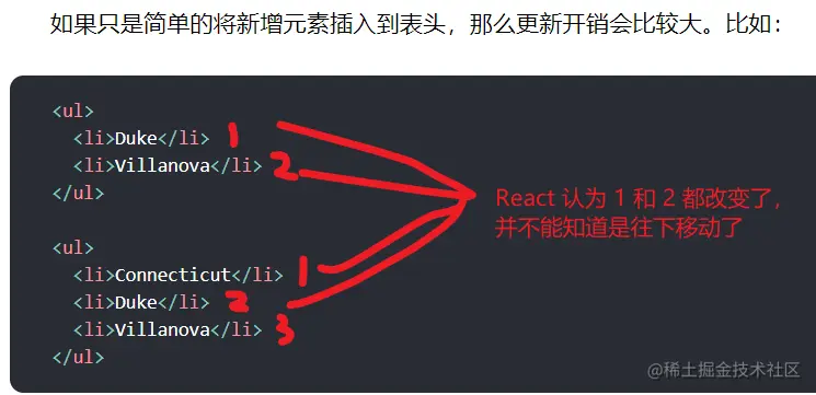 - 如果子元素列表前后有很多元素是一样的,但是顺序发生了很大改变(尤其是把其中一个元素放到了第一个),那么元素会被重新创建,这样会有性能损耗。因此需要引入 key。(使用假设2)
