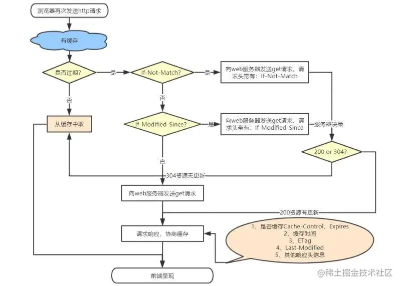当第一次请求时服务器返回的响应头中没有Cache-Control和Expires或者Cache-Control和Expires过期还或者它的属性设置为no-cache时(即不走强缓存),那么浏览器第二次请求时就会与服务器进行协商,与服务器端对比判断资源是否进行了修改更新。如果服务器端的资源没有修改,那么就会返回304状态码,告诉浏览器可以使用缓存中的数据,这样就减少了服务器的数据传输压力。如果数据有更新就会返回200状态码,服务器就会返回更新后的资源并且将缓存信息一起返回。跟协商缓存相关的header头属性有(ETag/If-Not-Match 、Last-Modified/If-Modified-Since)请求头和响应头需要成对出现