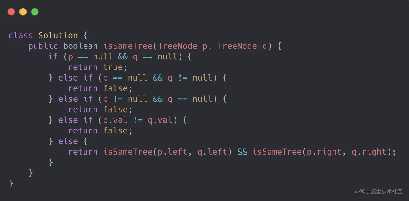 这里需要注意的是:两个二叉树是不是空的情况. 如果两个二叉树都是空,那就是相同。 两个二叉树中只有一个是空,那肯定是不同了。