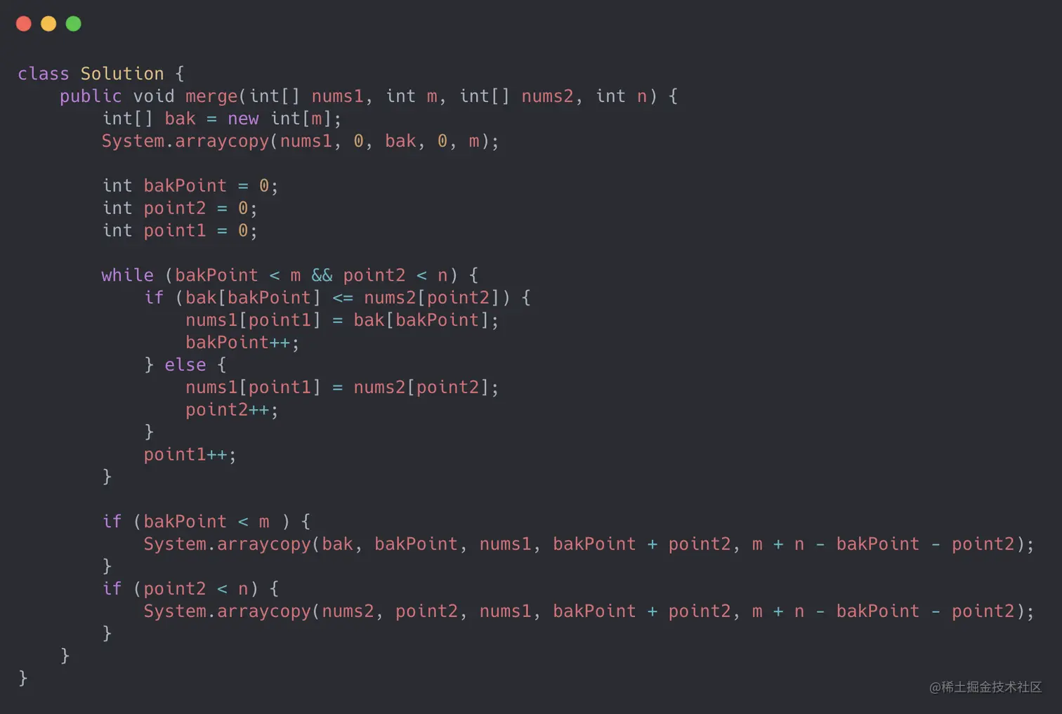 合并有序数组,第一反应就是双指针。用快指针和慢指针比较两个数组的当前元素,将比较小的元素放入目标数组中,指针此时+1,同时目标数组指针也向后移动一位。
