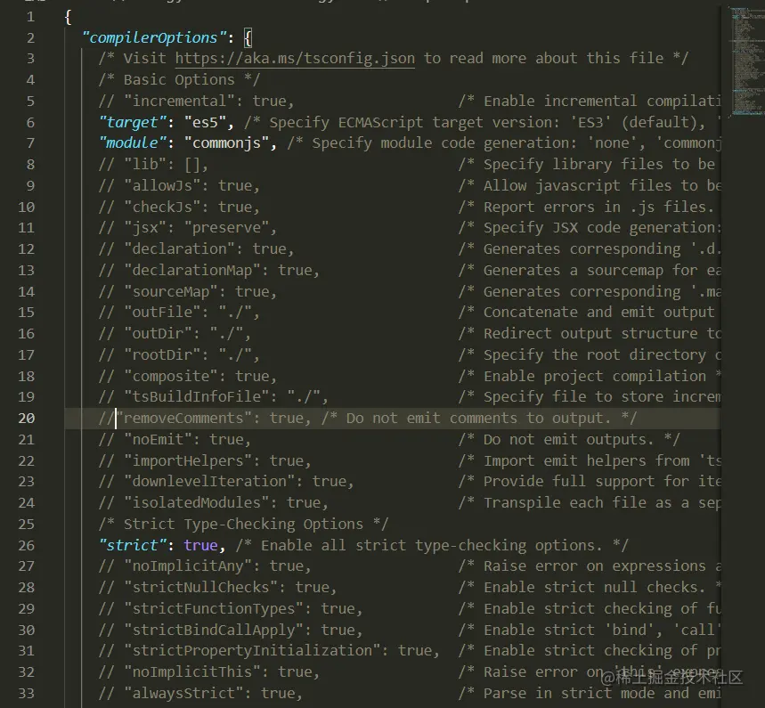 我们的.ts文件有一段注释,比如我们想配置编译完的.js文件没有注释,这时可以在tsconfig.json中找到removeComments这个属性,把注释打开