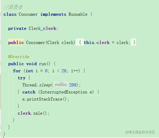 同理消费者的代码也类似,但是这里我们假设消费的会慢一些,200ms才能卖出一件,代码如下: