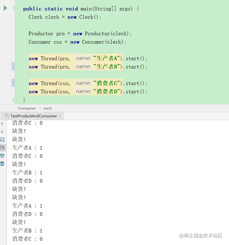 然后就要到激动人心的执行环节了,假设我们有两个线程来生产,又有两个线程来消费,但是前面我们也说了,消费的会慢一点,执行的效果会是怎么样呢?