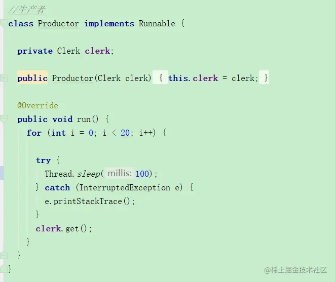 店员是个模型方法类,要执行多线还是得通过那几种创建线程的方法,这里我们就简单的使用实现Runnable接口来创建线程了,等以后开始讲线程池时再使用更为推荐的做法。于是我们这个生产者假设要生产20件产品,生产的速度为100ms一件,代码如下: