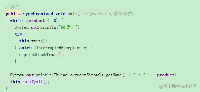同理,我们也需要有方法来卖货,卖的时候库房里没有或也不合适吧,所以我们也要控制当产品为0的时候要记得wait住。由于前面进货时如果库房满了会做wait操作,所以记得在卖完后要调用notifyAll方法通知生产者可以继续执行了啊,卖货的方法如下: