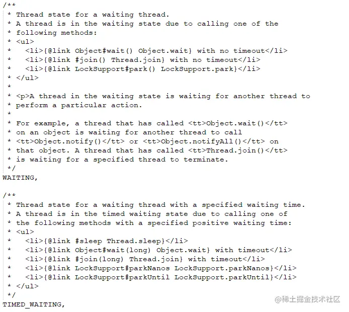 注释中简单明了的介绍了这些状态,我们只需要拥有一般的词汇量就能够清楚明白这些状态是什么含义。NEW、RUNNABLE、BLOCKED和TERMINATED状态都基本是见名知意了,通过它的名字以及简短的介绍我们就能够理解什么是新建状态、运行状态、阻塞状态以及死亡状态。关键就在于WAITING和TIMED_WAITING好像名字很接近,这两种状态究竟有什么区别,为什么要定义两种枚举类呢?