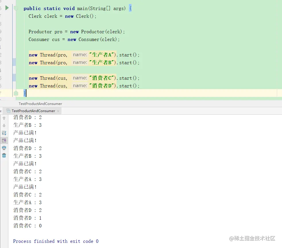 这一次我们的生产者消费者的代码到这里就实现完成了,总结起来也还是比较简单的,也就是生产达到一定数量需要调用wait方法来进行等待,消费到一定数量也需要等待,生产消费结束后需要通知其他线程继续执行就行了。唯一需要注意的坑就是判断数量要使用while来判断就好了。