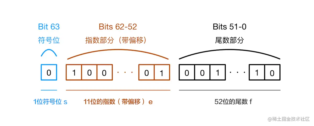 Javascript 是 64 位的双精度浮点数,最高的 1 位是符号位S,接着的 11 位是指数E,剩下的 52 位为有效数字M。