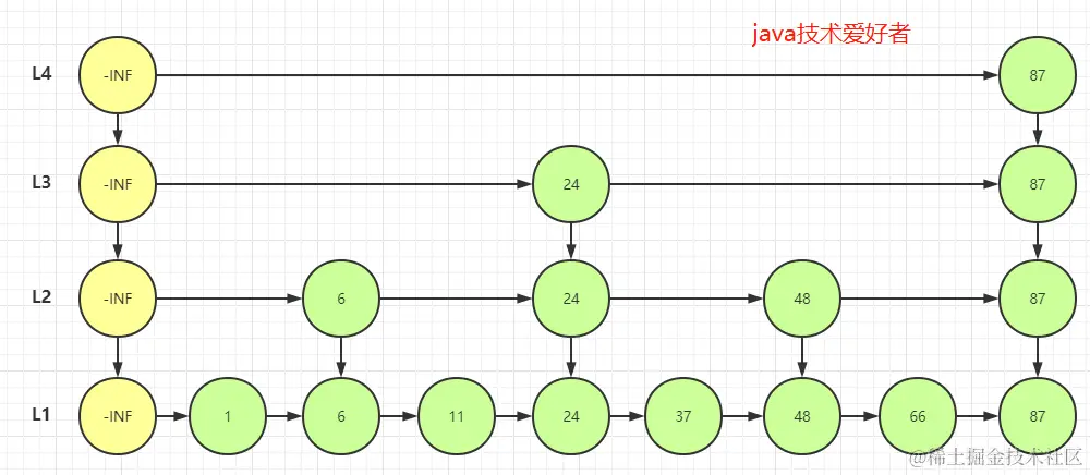 有没有发现经过L4,L3,L2层的查询后已经跳过了很多节点,当到了L1层遍历时已经把范围缩小了很多。这就是跳跃表的优势。这种方式有点类似于二分查找,所以他的时间复杂度为O(logN)。