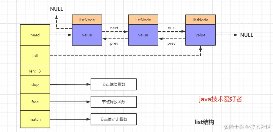 Redis中的linkedlist类似于Java中的LinkedList,是一个链表,底层的实现原理也和LinkedList类似。这意味着list的插入和删除操作效率会比较快,时间复杂度是O(1)。我们看源码: