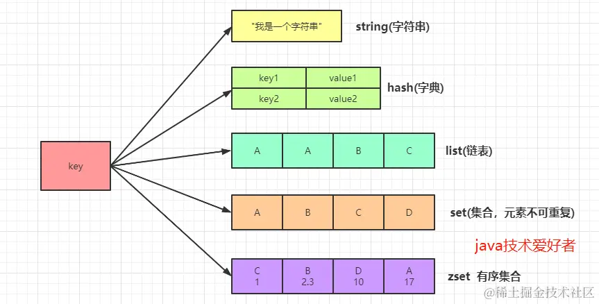 type表示保存的value的类型。通常有以下几种,也就是常见的五种数据结构:
