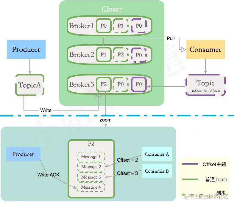 将Topic拆成多个段,增加并行度后,拆成的每个部分叫做Partition,分区一般平均分布在所有机器上。