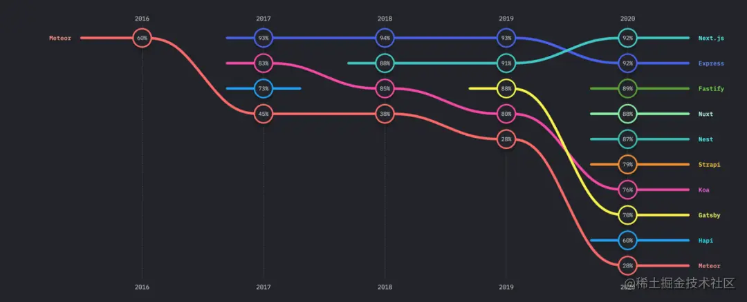 可以看出比较受欢迎的后端框架是 Express 和 Next.js,国内比较常用的 Koa 的满意度则在逐年下降。