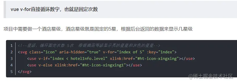在实际使用中,vue v-for直接循环数字,也就是固定次数。如星级评分。为了操作简单,直接百度,有小伙伴为我们提供了如下方法v-for 星级评分,截图如下。