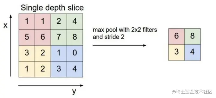 上图所示是最大池化,是取池化区域内最大的一个值作为最终输出的结果。除了最大池化外还有均值池化和随机池化等池化方法。