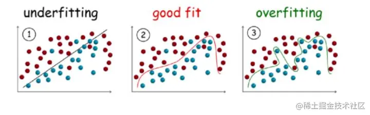 过拟合就是由过于追求完美拟合现有数据集,以至于会将单个数据点的特征认为是一般特征。图示很好的展示了欠拟合、拟合和过拟合三种情况。