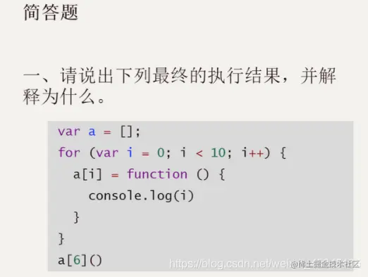答:结果是10。因为for循环里的i是全局变量,for循环执行完之后,i已经变成了10,所以之后无论调用a几,输出的都是10。