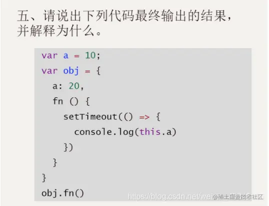 答:打印20。因为setTimeout是箭头函数,里面的this指向没有改变和fn函数里的this是一致的都指向obj,所以会输出20