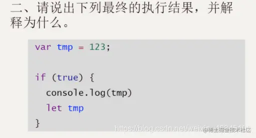 原因:let 会形成块级作用域和封闭作用域,所以 tmp 无法拿到外层 var 声明的值,只能在块级作用域中查找。let 不会导致变量提升,因此console.log(tmp)无法找到声明,出现暂时性死区。