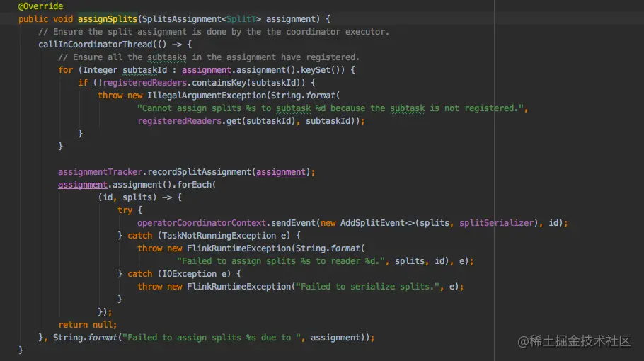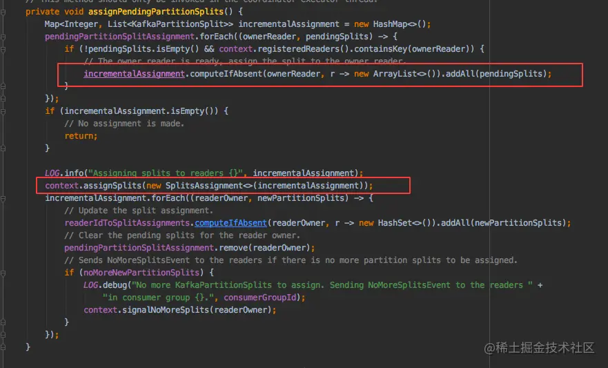 这个方法里关键的是这context.assignSplits()这个方法,这个方法将分组信息发送到了Reader端。