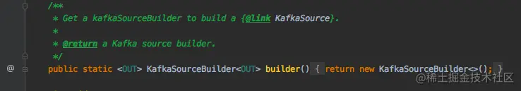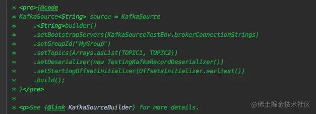 KafkaSource实例化一共调用了两个类,KafkaSource 和 KafkaSourceBuilder,注释中简单讲了一下如何调用。