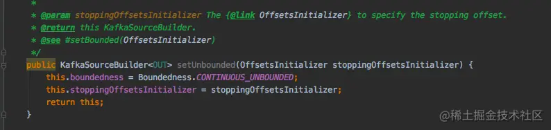可以看到KafkaSourceBuilder通过两个set方法来设置有界与无界,查看这两个方法的注释可以看到getBoundedness这个方法