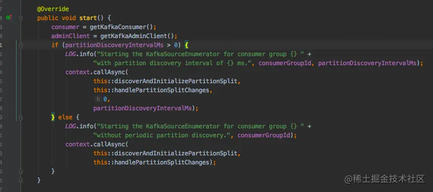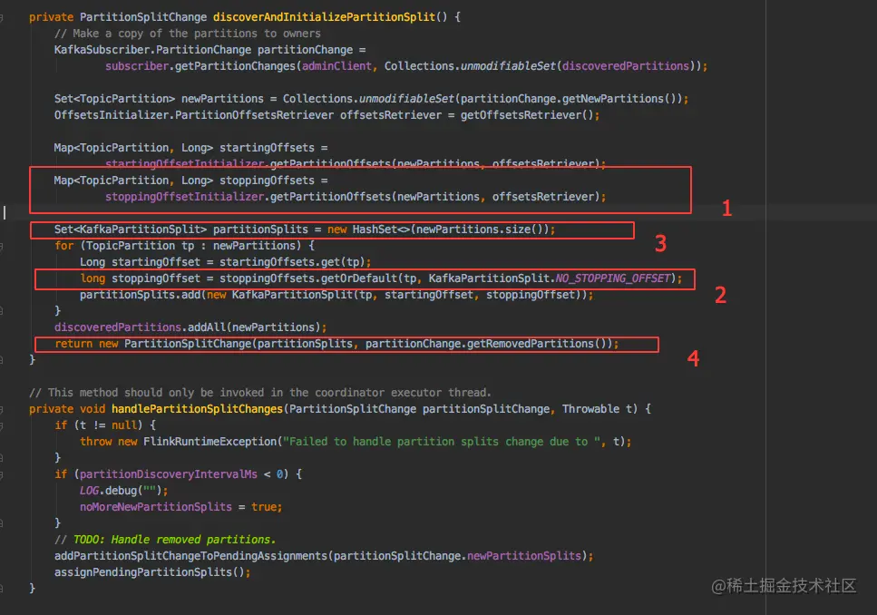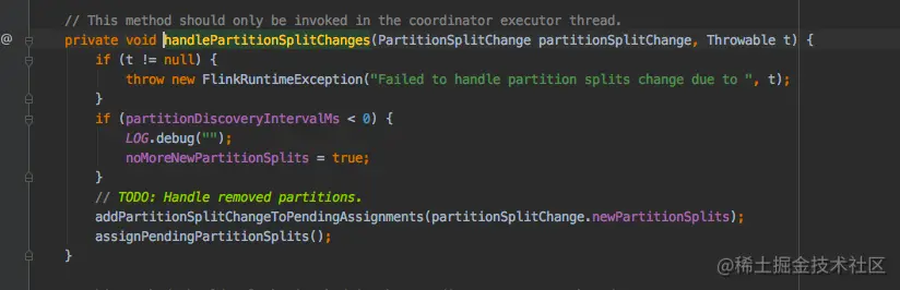 这个方法会被start()方法中通过异步方法context.callAsync()调取,最后面其实是一个通过handlePartitionSplitChanges方法传入discoverAndInitializePartitionSplit结果的异步调用