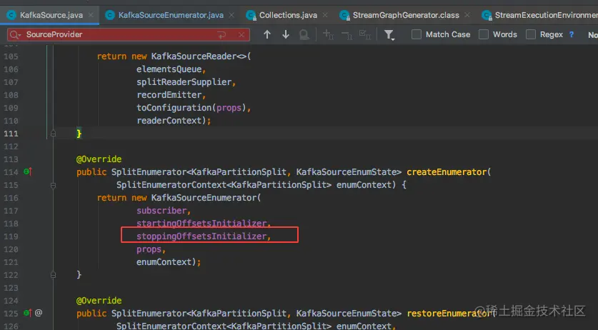 我们可以看到在setBounded时传入了一个stoppingOffsetsInitializer,层层定位后可以发现他被传入到了createEnumerator这个方法中,这个是实例KafkaSourceEnumerator的方法,在图上我进行了标注