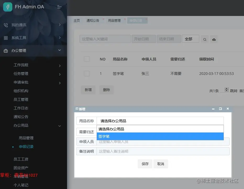 36. 申领记录:办公用品下级菜单,添加申领用品信息,备注是否需要归还,便于追还