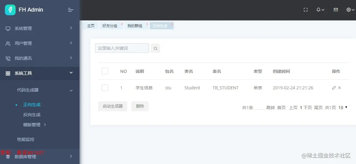 正向生成: 生成完整的模块,html页面、处理类、mapper层、service层、myabaits的xml 建表的sql脚本等