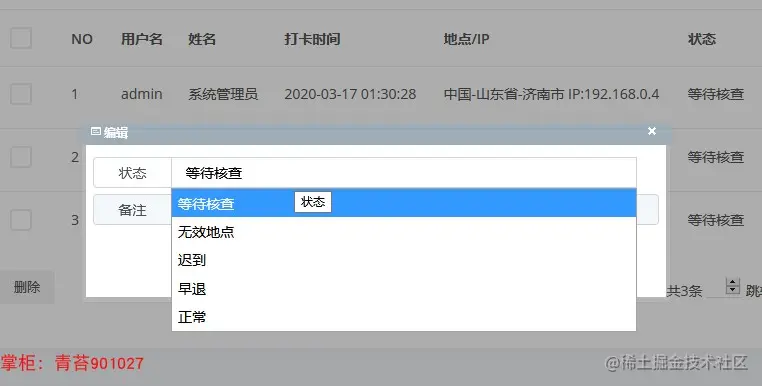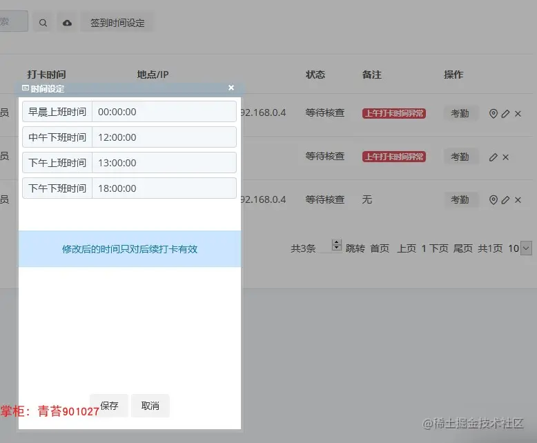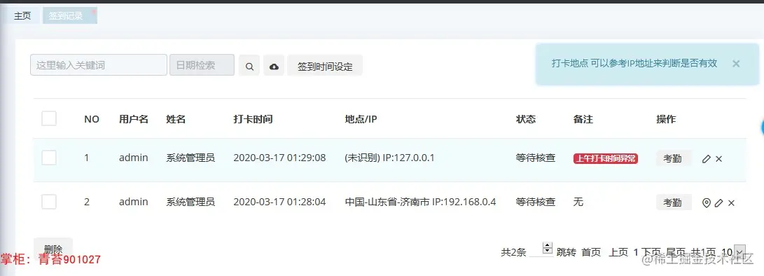 46. 签到记录:在手机端打卡签到,参考打卡IP、地点判断打卡位置,设定上下班等时间