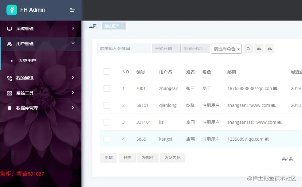 支持多用户分权限管理后台, 权限具体到不同的菜单不同的按钮(一个用户可以多个角色)