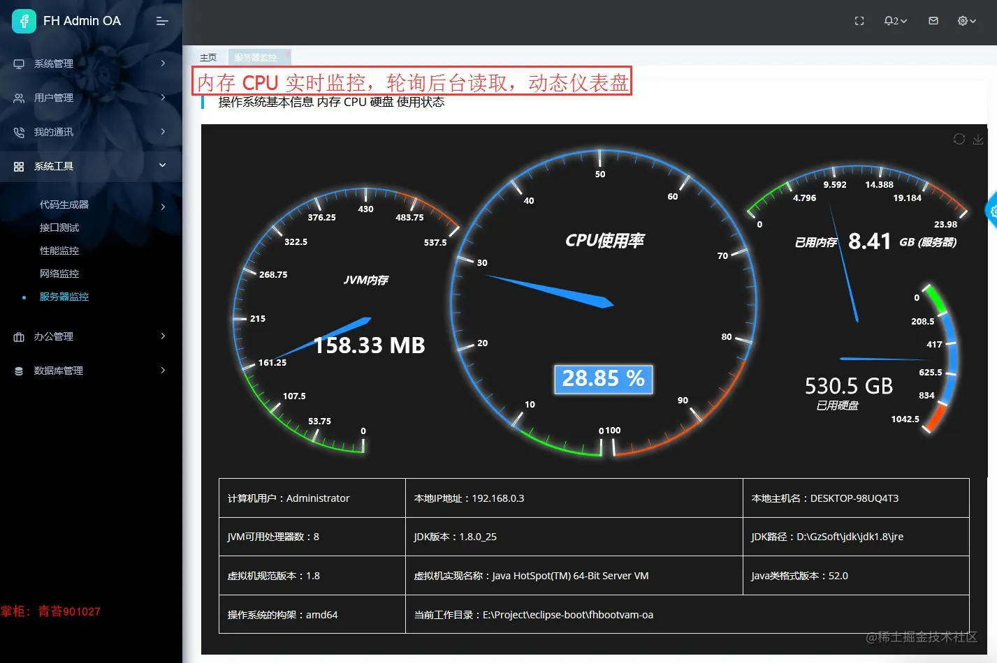 12.服务器监控:实时监控jvm内存,服务器内存,CPU使用率。 单次读取服务器其它配置等信息