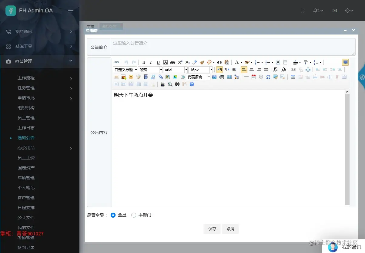 34. 通知公告:发布通知信息,根据组织机构权限,下级能看到上级发布的通知公告